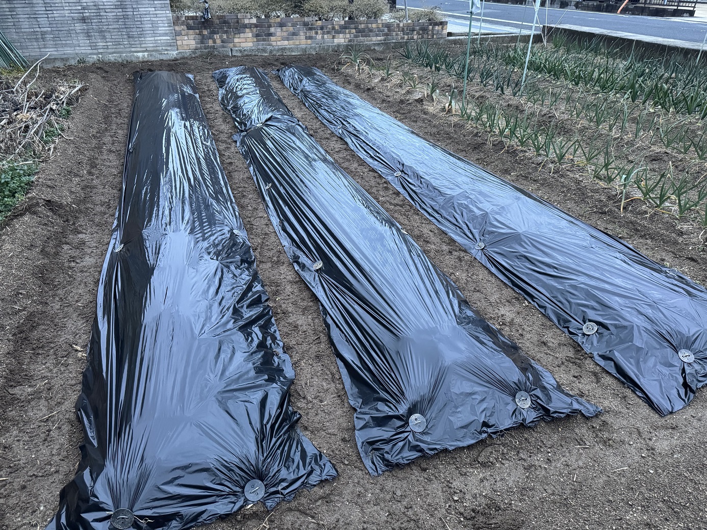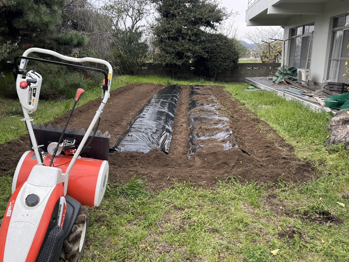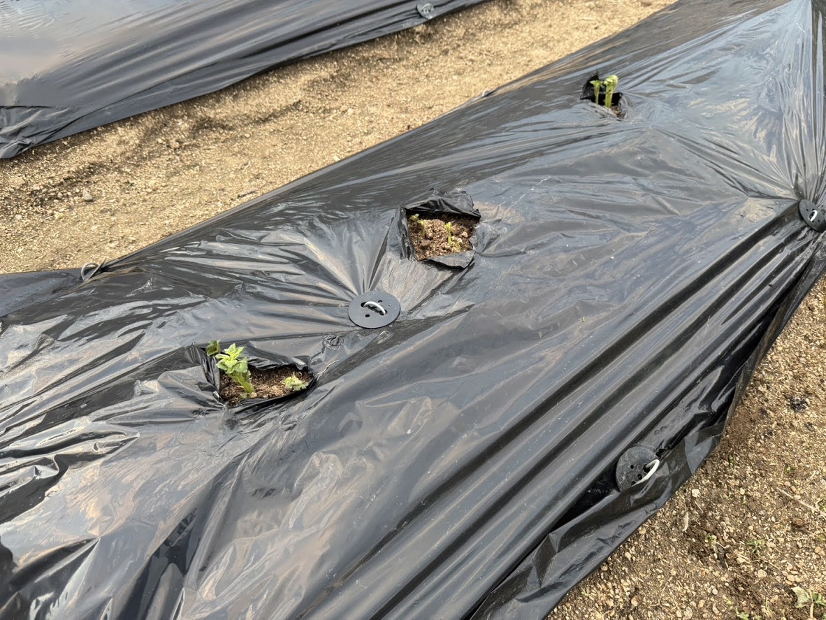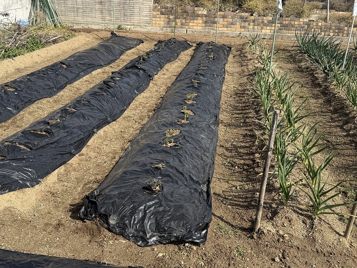 植えてすぐ雨の予報になり、雨よけと保温、防草対策にマルチを張りました。