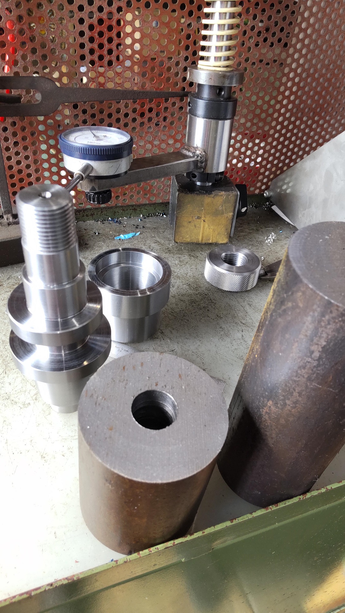 実技課題は、時間内に円筒の材料を3つの部品に加工し、組付けの出来を評価します